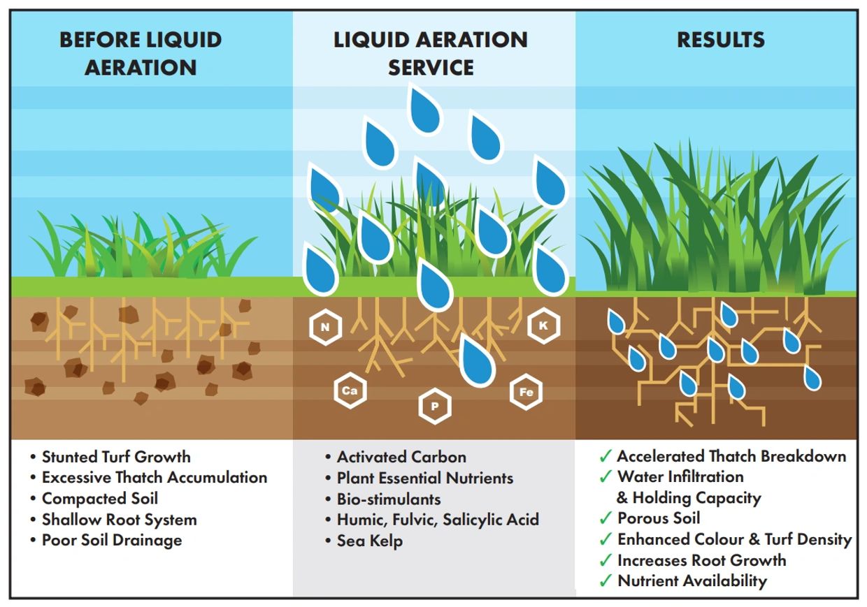 Liquid aeration is a soil conditioning treatment that helps loosen compacted soil without pulling cores. It supports: